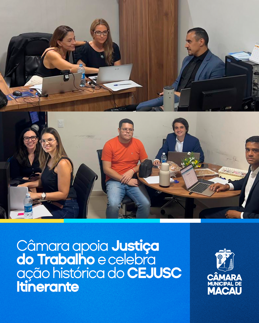 A Câmara Municipal de Vereadores de Macau sediou uma importante ação justiça do Trabalho no nosso município. Entre os dias 12 e 14 de maio de 2025, a Casa Legislativa sediou as audiências de conciliação do CEJUSC Itinerante do Tribunal Regional do Trabalho da 21ª Região (TRT21), resultando em um sucesso expressivo na resolução de conflitos trabalhistas.