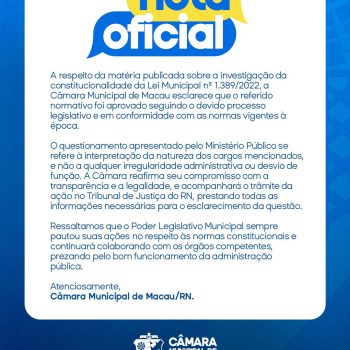 Nota de Esclarecimento A respeito da matéria publicada sobre a investigação da constitucionalidade da Lei Municipal nº 1.389/2022, a Câmara Municipal de Macau esclarece que o referido normativo foi aprovado seguindo o devido processo legislativo e em conformidade com as normas vigentes à época. O questionamento apresentado pelo Ministério Público se refere à interpretação da