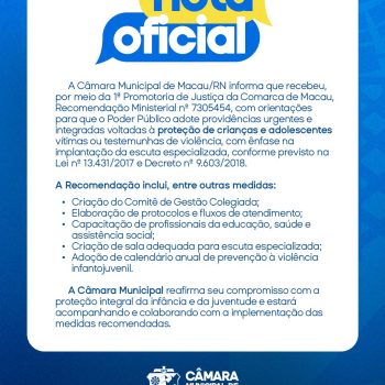 A Câmara Municipal recebeu recomendação do Ministério Público para que o município adote ações urgentes de proteção a crianças e adolescentes vítimas de violência, incluindo: 👥 Criação de comitê de proteção; 📑 Elaboração de protocolos e fluxos; 🎓 Capacitação de professores e profissionais da saúde e assistência; 🗣️ Implantação da escuta especializada; 📆 Calendário