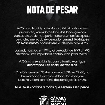 Nota de Pesar A Câmara Municipal de Macau/RN, em nome da presidenta Maria da Conceição dos Santos Lins e demais parlamentares, expressa suas condolências pelo falecimento do ex-vereador Jurandi Rodrigues do Nascimento. Que Deus conforte seus familiares e amigos neste momento de dor.