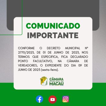 PORTARIA Nº154/2023 – GP – DECLARA PONTO FACULTATIVO, NA CÂMARA MUNICIPAL DE MACAU, CONFORME O DECRETO MUNICIPAL Nº 2770/2023, DE 01DE JUNHO DE 2023, NOS TERMOS QUE ESPECIFICA. O PRESIDENTE DA CÂMARA MUNICIPAL DE VEREADORES DE MACAU/RN, ROBSON KELLY COSTA PEREIRA, no uso das atribuições que lhe confere no inciso l, do artigo 10 do