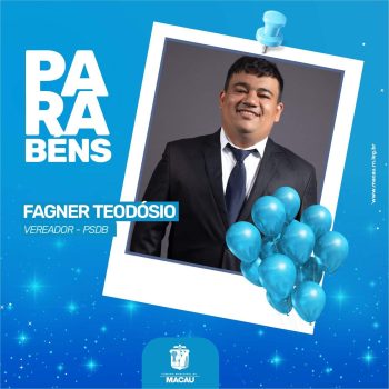 PARABÉNS PRA VOCÊ! A Câmara Municipal de Macau, através dos seus funcionários e vereadores, parabenizam O VEREADOR FAGNER TEODÓSIO, pela passagem do seu aniversário. Felicidades e que Deus continue abençoando sua vida.