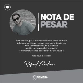 Filho querido, pai, irmão que vai deixar muita saudade. A Câmara de Macau vem por meio desta desejar ao Vereador Oscar Paulino e toda sua família, nossas condolências pelo falecimento precoce do seu filho Rafael Paulino. Que Deus o receba!
