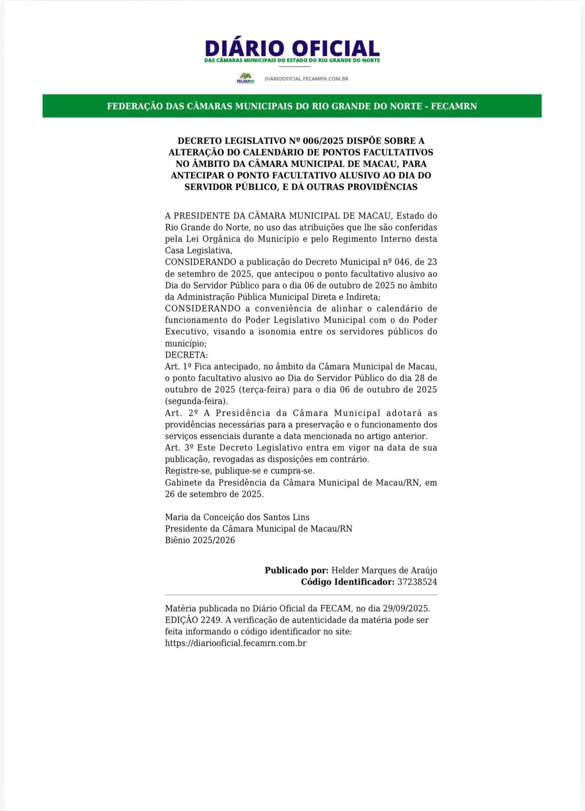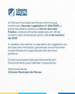 Art. 1º Fica antecipado, no âmbito da Câmara Municipal de Macau, o ponto facultativo alusivo ao Dia do Servidor Público do dia 28 de outubro de 2025 (terça-feira) para o dia 06 de outubro de 2025 (segunda-feira).