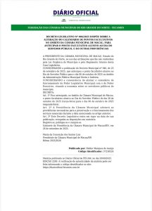 A PRESIDENTE DA CÂMARA MUNICIPAL DE MACAU, Estado do Rio Grande do Norte, no uso das atribuições que lhe são conferidas pela Lei Orgânica do Município e pelo Regimento Interno desta Casa Legislativa,