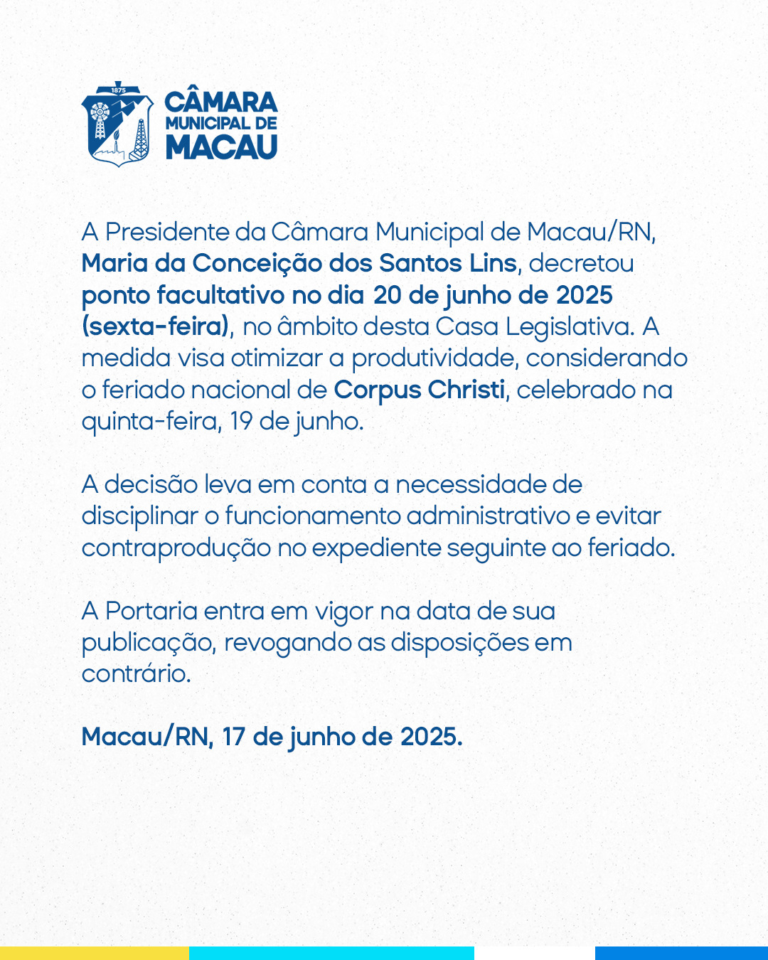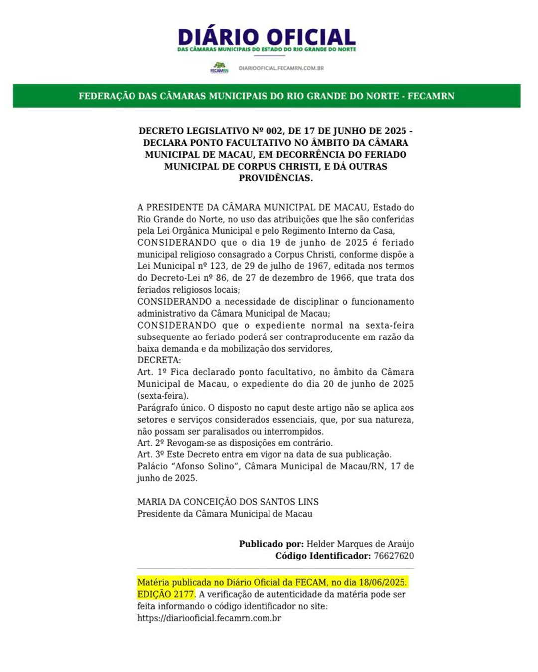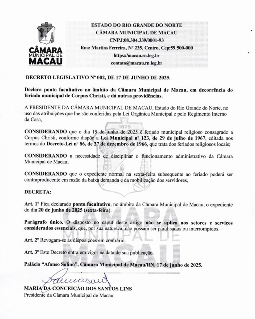 PONTO FACULTATIVO: DECRETO LEGISLATIVO Nº 002, DE 17 DE JUNHO DE 2025 DECLARA PONTO FACULTATIVO NO ÂMBITO DA CÂMARA MUNICIPAL DE MACAU, EM DECORRÊNCIA DO FERIADO MUNICIPAL DE CORPUS CHRISTI, E DÁ OUTRAS PROVIDÊNCIAS.